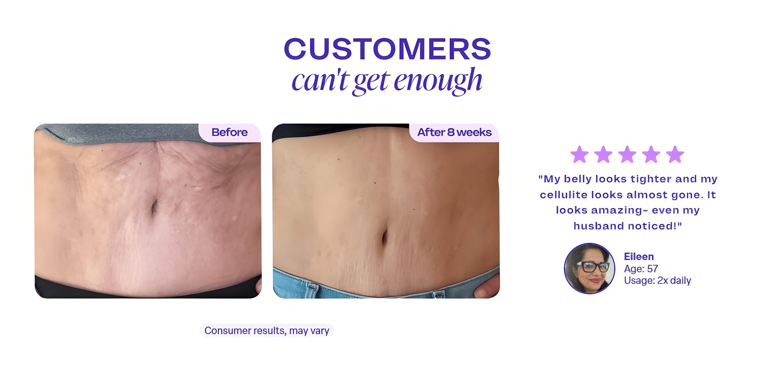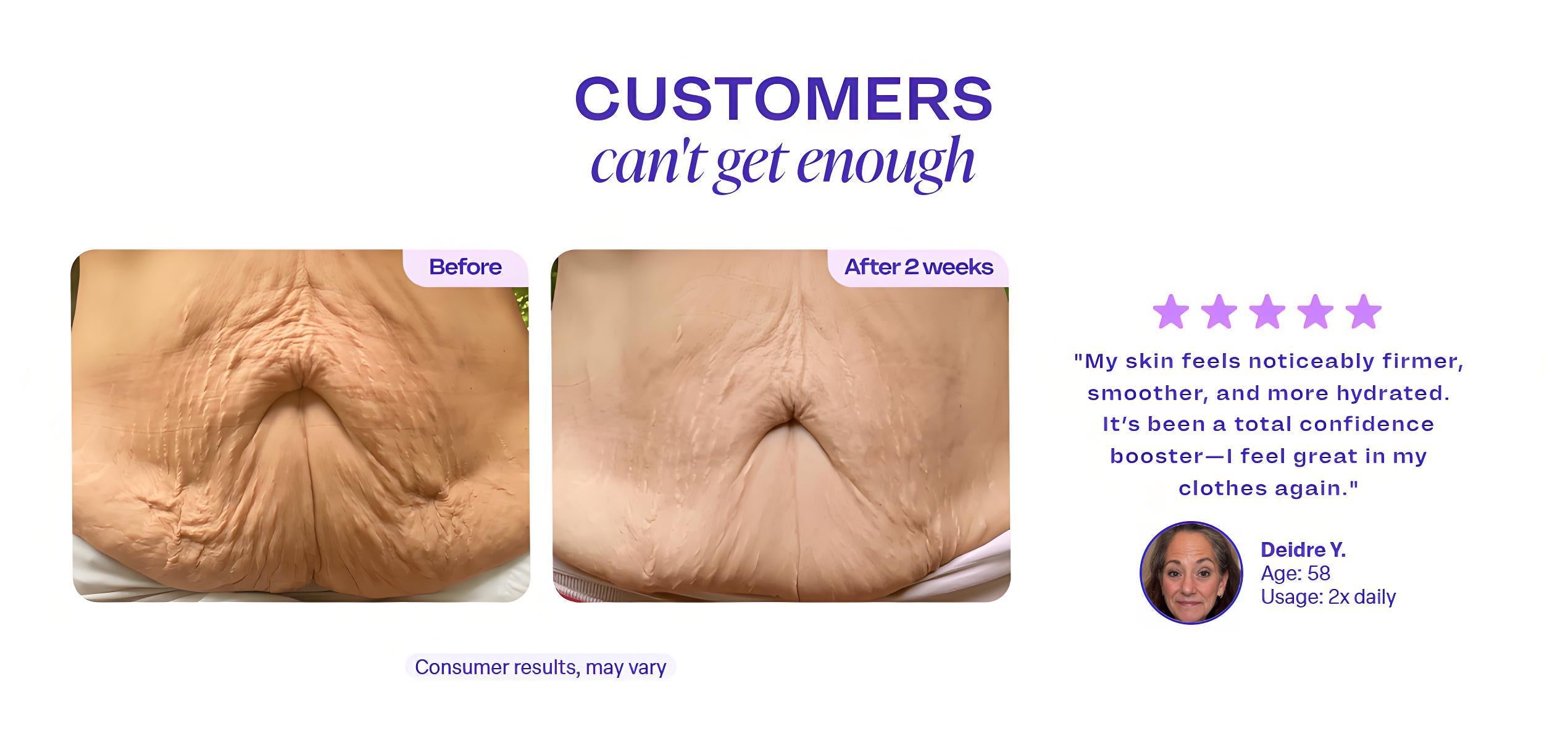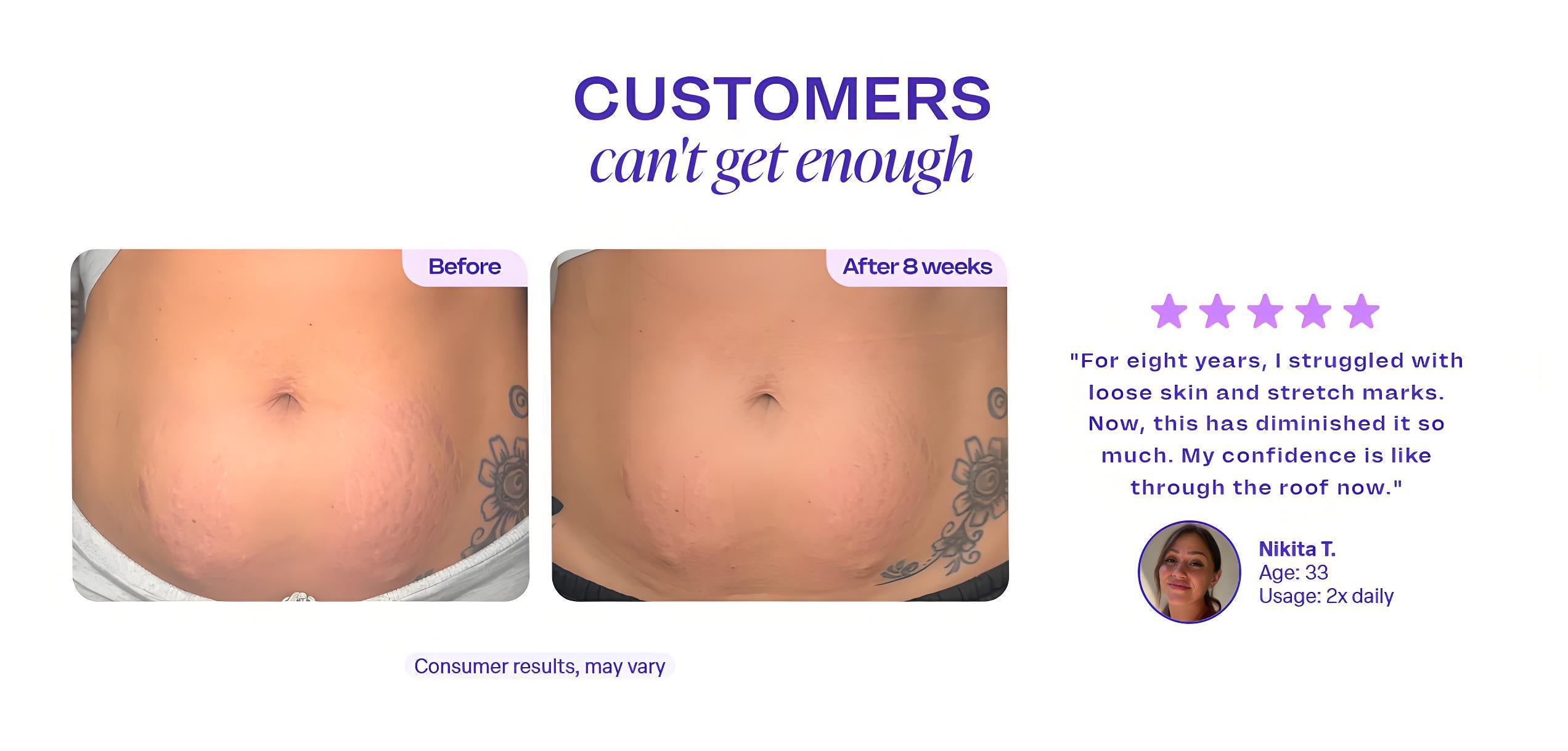 Many users notice smoother, more hydrated skin within the first few weeks. Most visible changes in firmness and stretch mark appearance are typically seen with consistent use over 4–8 weeks.