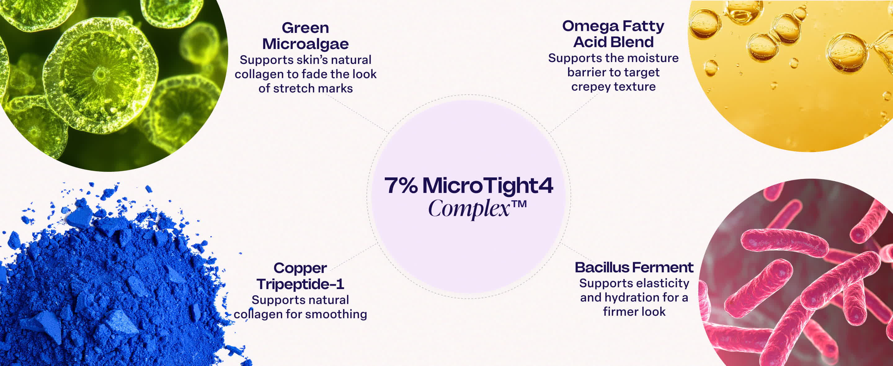 MicroTight4™ Complex – proprietary blend designed to target loose skin and stretch marks.